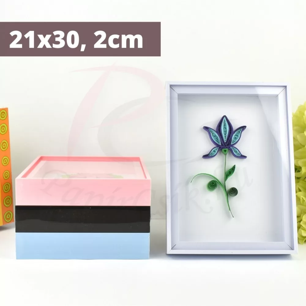 Der Quilling-Bilderrahmen ist 2 cm tief, sodass wir sicher sein können, dass unsere Kreation passen wird! Wir bieten auch ein 240 Gramm weißes Hintergrundblatt für den Rahmen. Oben befindet sich Plexiglas, wodurch unsere Kreation vor Staub geschützt wird. Es kann auf den Tisch im Liegen oder in Stehen gestellt werden, aber es kann auch auf die Wand gehängt werden. Material ist Kunststoff, Innengröße 21x30cm.
